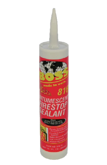 Boss or Metacaulk fire caulk. Used as a flame fire stop for interior use. General purpose sealant for use on through-penetrations for both horizontal and vertical surfaces. It is a single component, no-sag, water based sealant that is easy to apply and clean up. It cures to a flexible seal that is suitable for conditions where dynamic movement is expected. It bonds quickly, has excellent adhesion and is non-toxic. 10 FL. OZ.