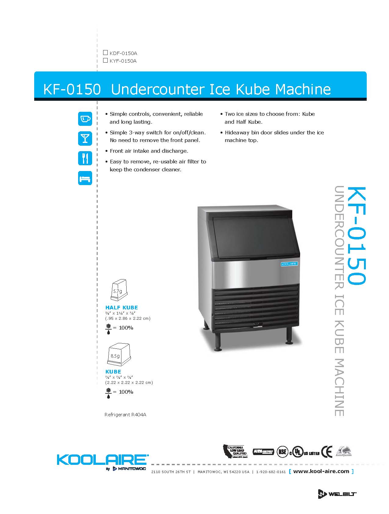 The all new 26" Wide x 26.5" Deep x 38.5" Tall Koolaire KDF-0150A-161B undercounter ice machine is the perfect addition to any small restaurant, bar, serving station, nurse station or outdoor kitchen. The KDF-0150A-161 is a 115 volts commercial ice machine, capable of producing up to 168 lbs of ice in a 24 hour period! Includes a built in storage bin holds up to 92 lbs of ice. It's convenient size and front air intake and discharge condenser allows for a variety of installation locations and easy cleaning.The Koolaire KDF-0150A produces full size ice cubes which melt slowly making it the perfect choice for cocktails, sodas, tea, and water. If you are looking for Half-Cube size ice, check out the KYF-0150A link here, which cool drinks quicker and take up less space in glasses.
