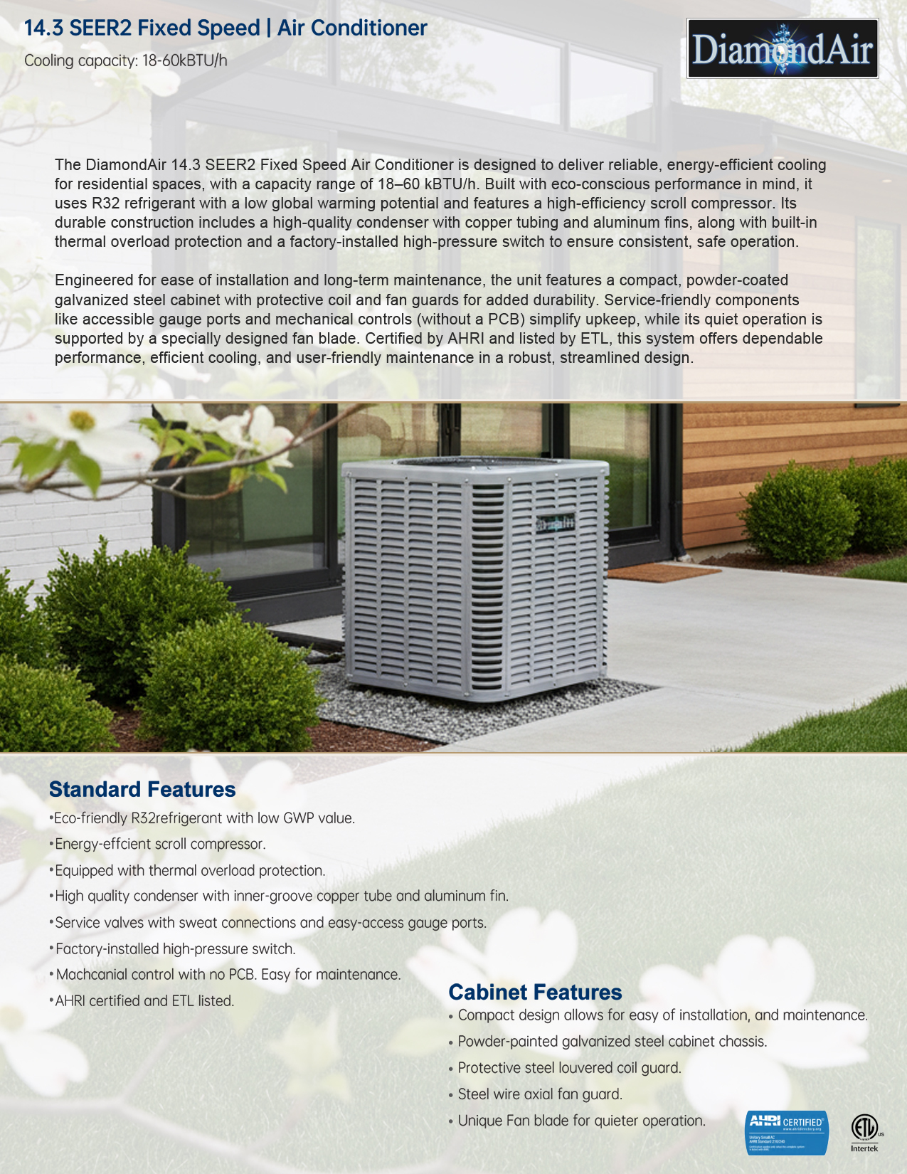 DiamondAir has been providing reliable, quality built HVAC equipment to North America for well over a decade. The new SEER2 straight cool condensers achieve up to 15.2 efficiency rating. With a strong cabinet design, state-of-the-art engineering and competitive pricing, DiamondAir continues to deliver 'Comfort & Quality so you can rest easy'!