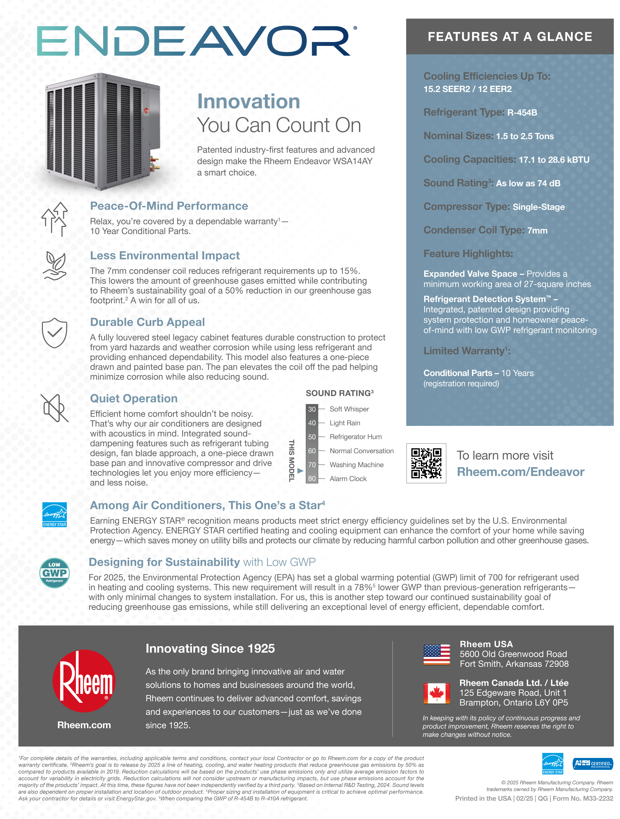 The Rheem Select model WSA14AY18AJ1NA 1.5 Ton Compact Air Conditioner Condenser delivers dependable cooling performance while featuring a small footprint cabinet designed for tight installation spaces. As part of Rheem’s Endeavor™ Select iC Series, this condenser provides 13.8 to 15.2 SEER2 efficiency and utilizes R-454B refrigerant, supporting the HVAC industry's transition to next-generation lower global warming potential (GWP) refrigerants.