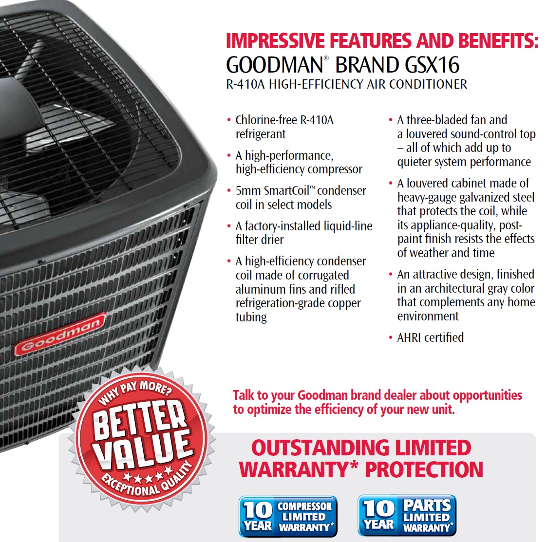 Goodman strives to provide high performance, energy efficient and durable equipment. Your GSX16 & ASPT will provide reliable heating & cooling for years to come. With the new GSX16/ASPT SMART design, this system meets the new 2015 EPA laws.
