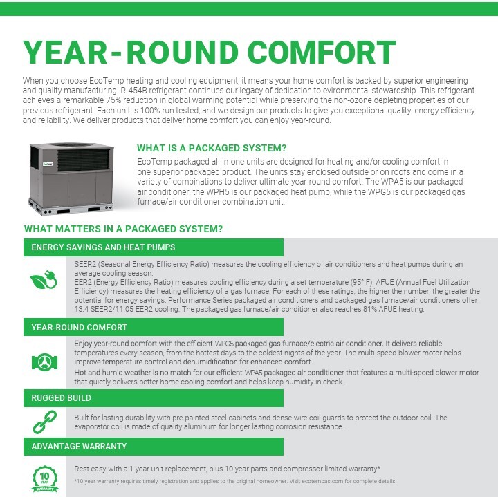 2 Ton EcoTemp 13.4 SEER2 R454B Heat Pump DOWN-FLOW or HORIZONTAL Package Unit WPH524A000RKB