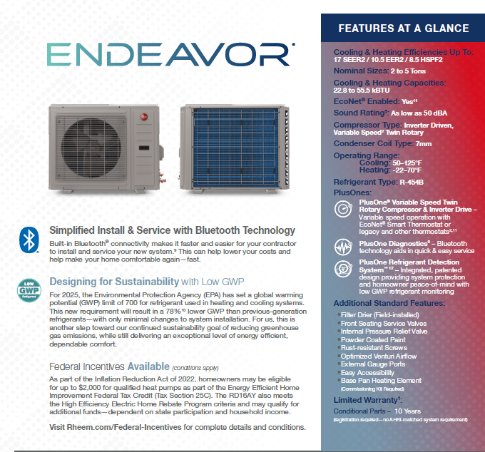 The Rheem Endeavor RD16AY is a compact, ultra-quiet, and highly efficient side-discharge heat pump designed for homes where space is at a premium. Part of the "Sound & Space Constraint Solution," this unit features a slim profile that fits easily in cramped locations while delivering powerful whole-home comfort.