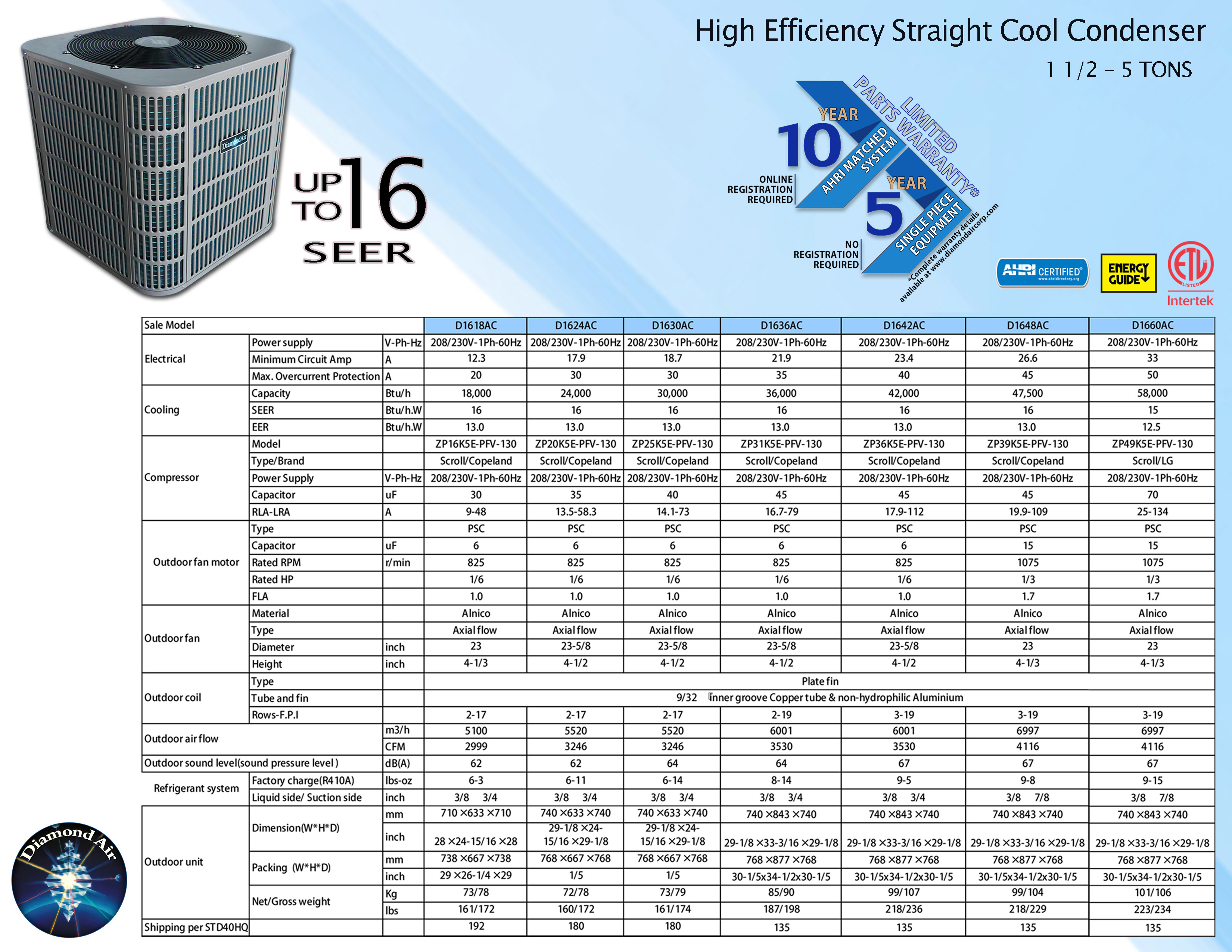 4 Ton DiamondAir 16 SEER Condenser D1648AC