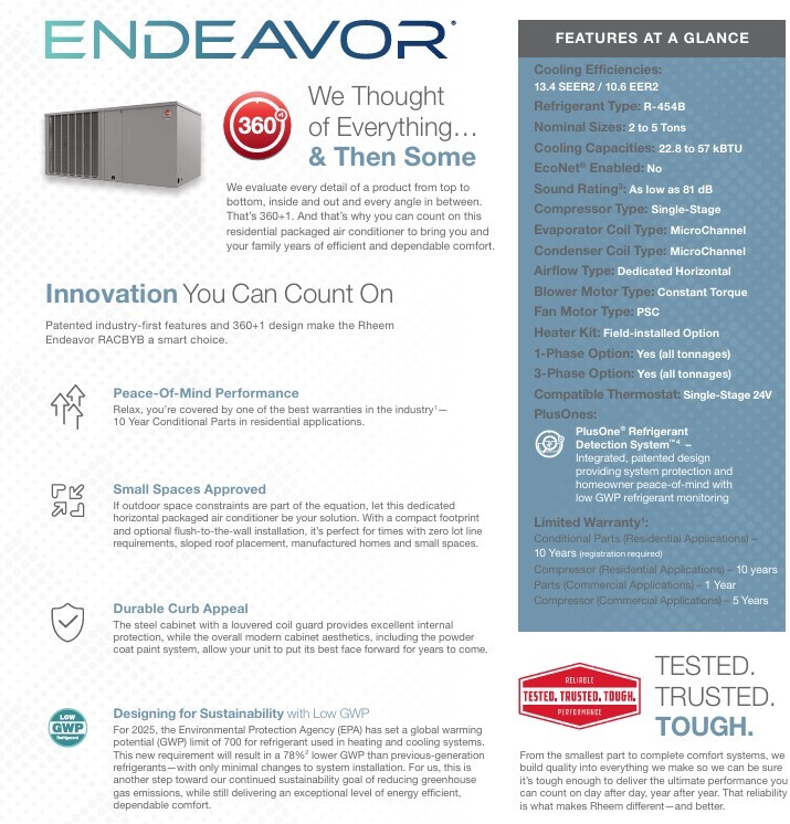 RACBYB Endeavor Classic 13.4 SEER2 Horizontal Packaged Air Conditioner, R454B, 208-230/1/60