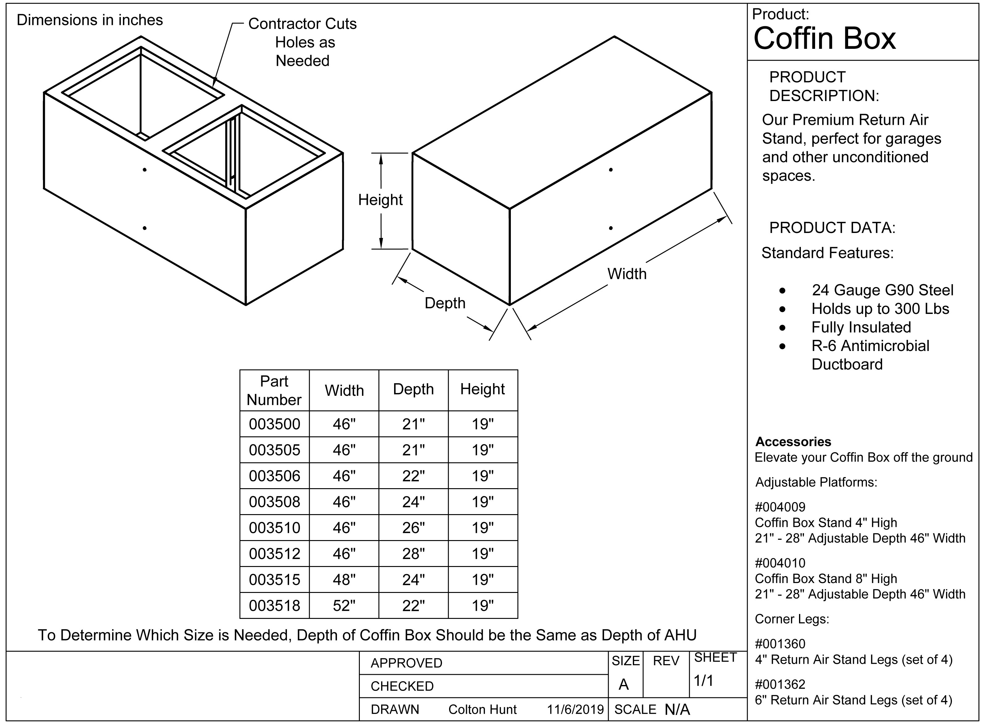 The fully insulated coffin box is ideal for use in tight spaces or installation scenarios that require return air duct to be installed on top of air handler box versus side or back mount. Prefect for garages and other unconditioned spaces. Constructed out of 24gauge G90 Steel and R-6 1.5" Antimicrobial Ductboard holds up to 300lbs.