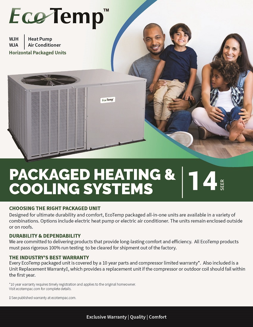 The EcoTemp 2 ton horizontal package unit model number WJA424000K000K is built to stand the test of time and features the industries best warranty which includes a 10 year all parts warranty *with registration* and a 1 year quality pledge warranty if an outdoor coil or compressor were to fail in the first year. EcoTemp is built by International Comfort Products (ICP) which is a subsidiary of United Technologies Corporation (UTC) which produces Sikorsky helicopters and Aerospace systems; both companies do not compromise on quality. The EcoTemp horizontal package unit features Copper tube/aluminum fin condenser and tin−coated copper evaporator coils, TXV valve metering and a direct drive multi-speed ECM blower motor with a pre-painted steel cabinet and no-rust base pan. The EcoTemp WJA series were intentionally engineered to be a compact design for narrow lots and ease of installation, allowing service from the front and side with horizontal supply and return openings. The units are only 51in Wide x 32 in Deep and feature environmentally friendly R-410A refrigerant!