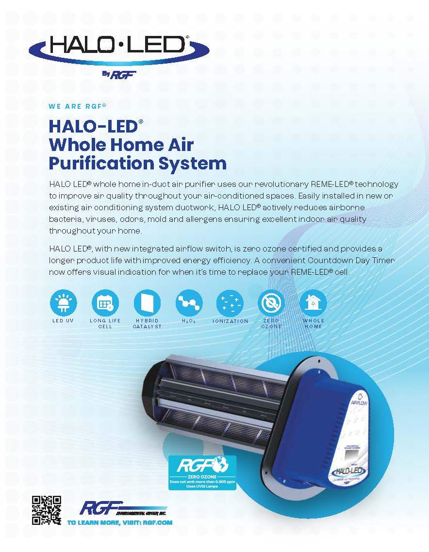 HALO LED-AS whole home in-duct air purifier uses RGF revolutionary REME-LED technology to improve air quality throughout your air-conditioned spaces. Easily installed in new or existing air conditioning system ductwork, HALO LED actively reduces airborne bacteria, viruses, odors, mold and allergens ensuring excellent indoor air quality throughout your home. The HALO LED, with new integrated airflow switch (AS Model), is zero ozone certified and provides a longer product life with improved energy efficiency. A convenient Countdown Day Timer now offers visual indication for when it’s time to replace your REME-LED cell.